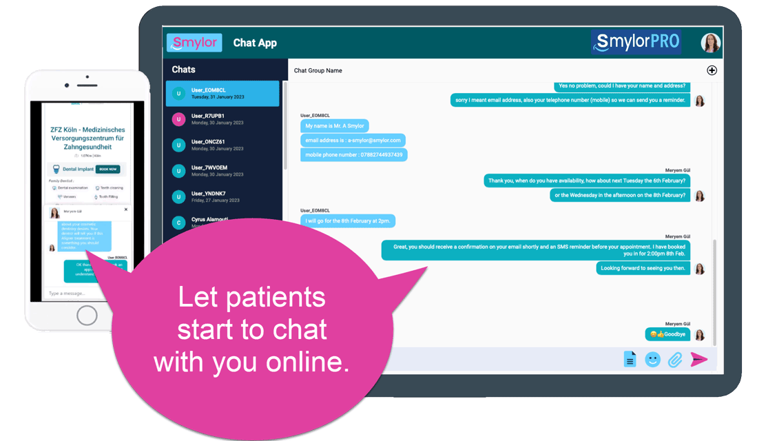 Registrieren Sie sich bei Smylor und nutzen Sie den kostenlosen Online-Chat- und Buchungsservice, um Ihre Zahnarztpraxis zu entlasten. Animieren Sie Ihre Patienten dazu, ihre Erfahrungen mit der Zahnbehandlung auf Smylor zu bewerten, und erhalten Sie wertvolle Einblicke, wie Sie die Patientenbeziehungen verbessern können.